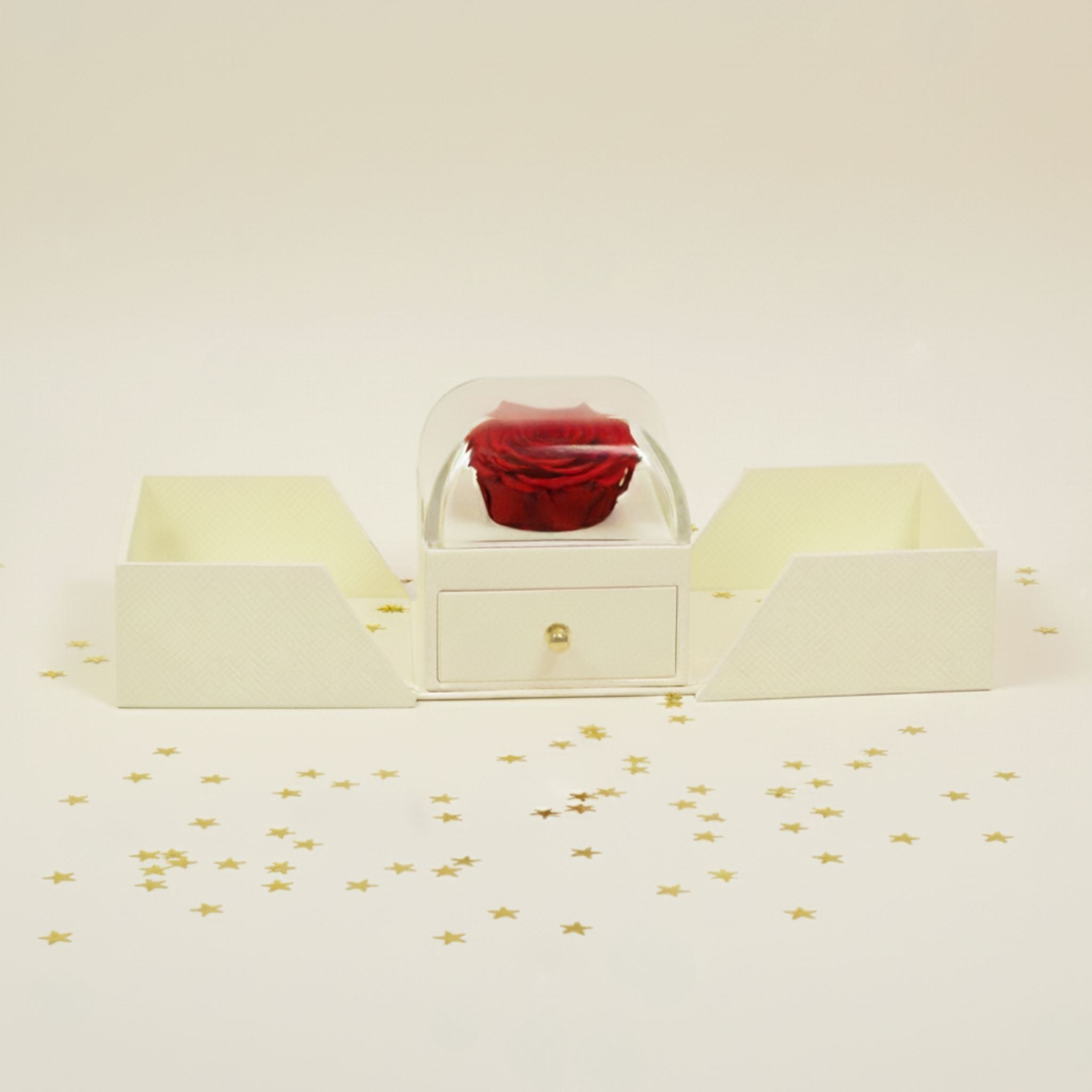 Há amores que duram para sempre. Este é um presente pensado para celebrar esse carinho que, com os anos, só se torna mais forte. É um detalhe duplo: a beleza de uma flor que não murcha e um lugar especial para guardar as vossas joias mais queridas.